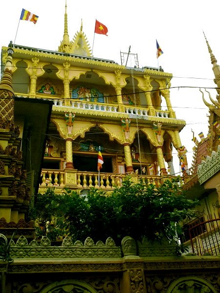 Chúng tôi tiếp tục men theo bên hông để lên tầng ba. Diện tích tầng ba cũng bằng tầng hai và tầng một nhưng trang trí với nhiều sắc trắng hơn. Vách tường được đắp nổi phù điêu nữ thần Têpanon – Phanhites cộng với Phanhi Phlong. Các cột trụ tầng ba đắp nổi hoa văn Angkor toàn thân. Ngoài ra còn được trang trí bằng mười sáu bức tranh minh họa, thuật chuyện cuộc đời của đức Thích Ca từ đản sanh đến Phật nhập niết bàn. Vách ngoài tầng ba đắp hoa văn đặc thù của văn hóa Khmer Angkor hòa hợp với Khmer Nam bộ. Giữa chính điện tầng ba có thêm các tượng nằm là tượng Phật nhập niết bàn. Có hai tượng Phật ngồi xếp bằng hai bên bằng đá được thỉnh về từ Campuchia.