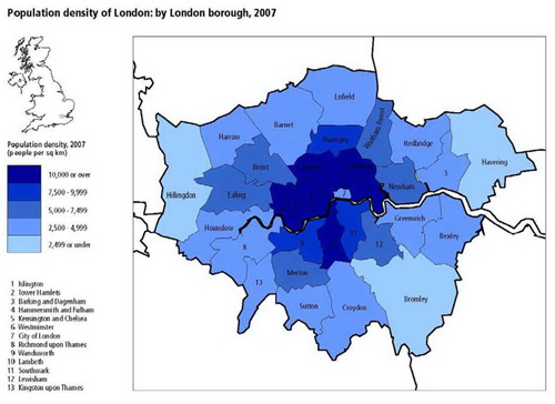 Hãy xem bản đồ phân bố mật độ dân cư thủ đô London – một trong những trung tâm kinh tế, văn hóa, giáo dục của thế giới. Diện tích không gian đô thị 319 km2; mật độ dân số trung bình khoảng 8.980/km2; GDP (2008) 565 tỷ USD. Hiệu suất GDP/ km2 1,771 tỷ USD/ km2. Chú ý: khu vực số 7 là City of London có mật độ <5000/ km2; là nơi đặt Trung tâm quyền lực nhà nước và thành phố.