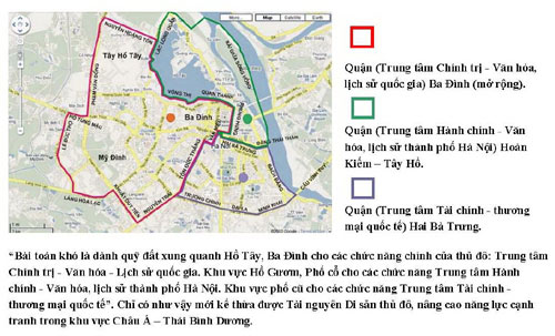 “Bài toán khó là dành quỹ đất xung quanh Hồ Tây, Ba Đình cho các chức năng chính của thủ đô: Trung tâm Chính trị – Văn hóa – Lịch sử quốc gia. Khu vực Hồ Gươm, Phố cổ cho các chức năng Trung tâm Hành chính – Văn hóa – Lịch sử thành phố Hà Nội. Khu vực phố cũ cho các chức năng Trung tâm Tài chính – thương mại quốc tế”. (xem: Cái khó của đô thị là không nhìn thấy bệnh dàn trải). Chỉ có như vậy. mới kế thừa được Tài nguyên Di sản thủ đô, nâng cao năng lực cạnh tranh trong khu vực Châu Á – Thái Bình Dương.