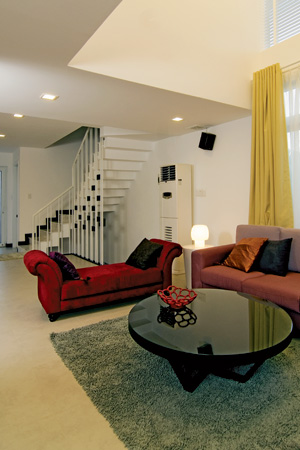 4. KTS Trương Vũ Quang Huy : Phòng khách một biệt thự nhưng lại khiêm nhường đưa về phía sau nhà và nhìn ra sân vườn sau. Ở đây bộ bàn ghế với kích thước lớn để nhấn mạnh tính tiện nghi. Để tạo khoảng nhìn thoáng, một ô cửa xẻ dài để người ngồi bên trong ở góc nào cũng nhìn được ra bên ngoài. Thành ô cửa được sơn màu để khi ánh sáng chiếu vào tạo nên hiệu ứng ánh sáng màu.